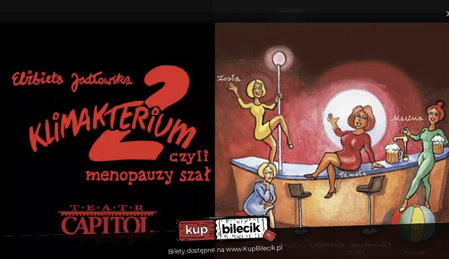 Wydawało nam się, że o klimakterium powiedzieliśmy już wszystko… Myliliśmy się! Elżbieta Jodłowska powraca z nowym hitem! „Klimakterium 2 czyli Menopauzy Szał” powstało na wyraźną prośbę publiczności, która chciała poznać dalsze losy bohaterek – już nie młodych, ale jakże młodych. Wciąż walcząca z nadwagą, ale już nie bezrobotna Pamela i Zosia, zaradna pani domu, starym zwyczajem przybywają świętować kolejne urodziny Maliny. Tym razem spotykają się w jej, dopiero co otwartym, pubie. Brakuje tylko Krychy, która też miała przybyć, ale… tego nie zdradzimy! Za to pojawia się, obdarzona liryczną duszą, Angela, która wraz z Maliną prowadzi interes. Gdzie zaś zbierają się tak różne kobiety, które tyle czasu się nie widziały i mają sobie wiele do powiedzenia, tam jest głośno, śmiesznie i zaczyna się zabawa! Ponad 1800 przedstawień „Klimakterium…i już” w ciągu 6 lat od premiery wyraźnie pokazuje, że kobieta wraz z jej problemami, to temat niewyczerpany. Nasze bohaterki ,,wyklęte wstały z poniżenia” i realizują to, o co tak walczyły w pierwszej części: udowadniają, że klimakterium to nie koniec świata, a dopiero początek nowego życia. Zupełnie nowe piosenki we wspaniałych aranżacjach i z zabawnymi tekstami, których nie można przestać nucić, złożone choreograficzne układy i ta niepowtarzalna energia, którą występujące na scenie aktorki dzielą się z publicznością. Częścią z nich spotkaliśmy się w „Klimakterium…i już!”, ale do tego zacnego grona dołączyły też nowe artystki, jedna lepsza od drugiej i wszystkie zupełnie znakomite. I każda z nich wnosi do spektaklu coś zupełnie niepowtarzalnego. Podczas spektaklu panie bawią się wyśmienicie – także te na widowni. I panowie ze zdumieniem stwierdzają, że coraz śmielej klaszczą i śpiewają ze wszystkimi. To prawdziwa terapia śmiechem – kojąca i skuteczna – pod jej wpływem nabieramy dystansu do siebie, innych, naszych zranień i lęków. Bo „Menopauzy szał” ogarnia wszystkich, a zwłaszcza tych, którzy się tego zupełnie nie spodziewają.