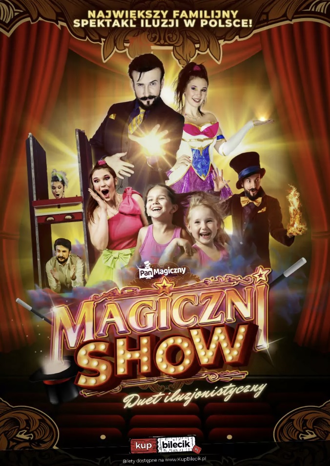 Kim są Magiczni? To jedyny polski duet iluzjonistyczny w składzie: Sebastian Grabowski przez tysiące dzieciaków zwanym Panem Magicznym oraz Martyna Grabowska, Pani Czarująca. Magiczni od ponad 15 lat specjalizujący się w oczarowaniu najlepszych imprez familijnych w Polsce i na świecie. Jedyny Polski Duet iluzjonistyczny, który występował w ponad 10 krajach, w tym odbyli tourneé po Azji. Frajdę ze spektaklu można porównać do nieskończonego rozpakowywania prezentów… to co chcesz rozpakować swój? Nie zwlekaj i doświadcz tego osobiście. Kup bilet i zabierz swoją rodzinę na magiczną jazdę bez trzymanki! Spektakl od 5 do 105 lat!