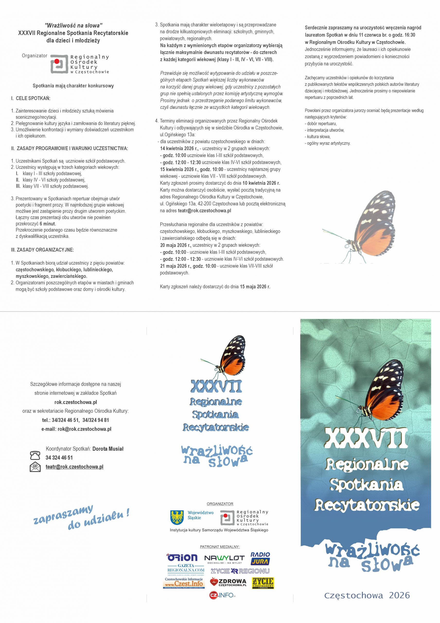 Eliminacje Regionalne dla najlepszych recytatorów odbędą się dniach 20 i 21 maja 2026 r. w Regionalnym Ośrodku Kultury w Częstochowie (ul. Ogińskiego 13a). Uroczystość Finałowa dla laureatów XXXVII Regionalnych Spotkaniach z Poezją i Prozą „Wrażliwość na słowa” odbędzie się w 11 czerwca 2026r. w Regionalnym Ośrodku Kultury w Częstochowie.